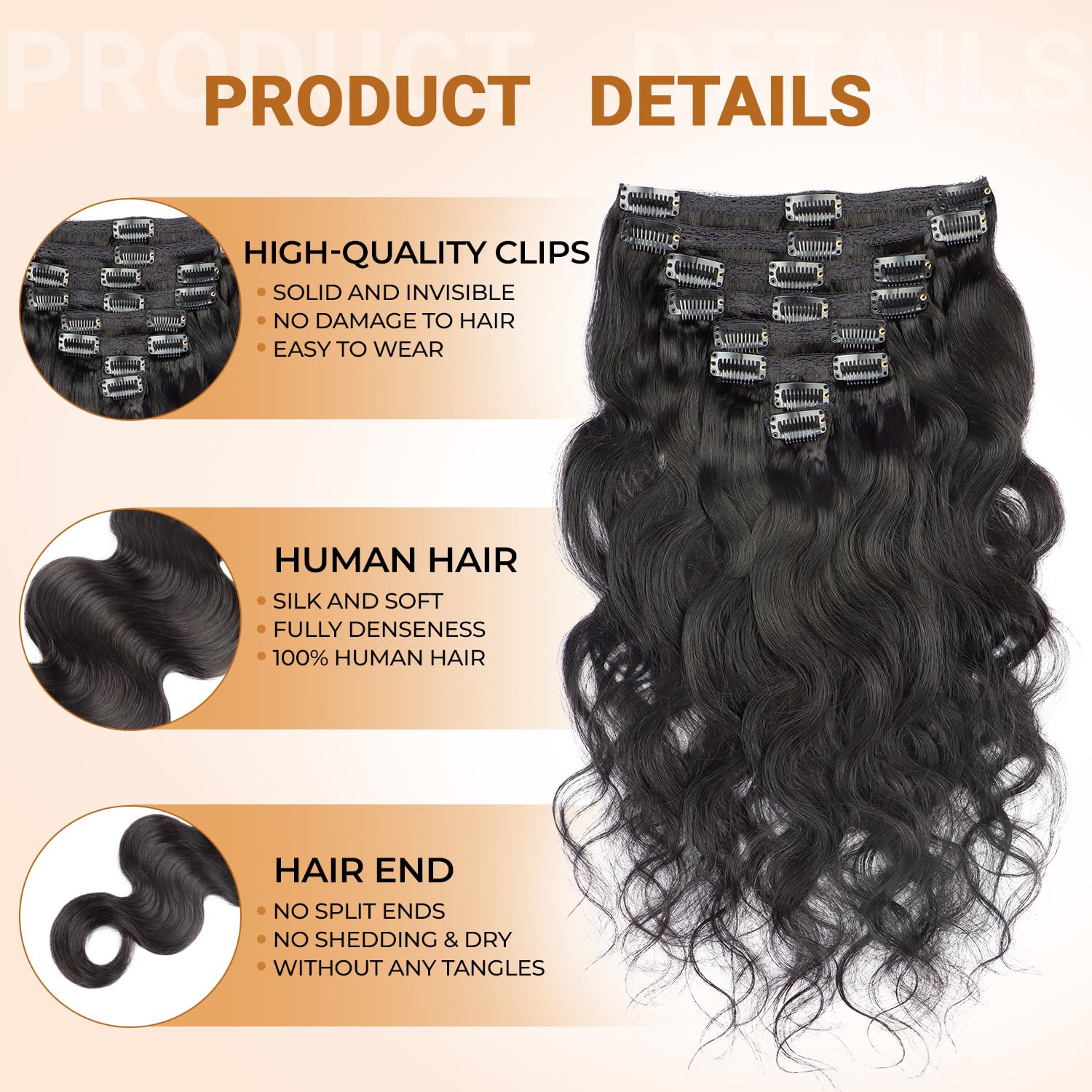 - 【High Quality Clip Hair】Body wavy clip in hair extensions, 100% unprocessed virgin human hair extensions, soft and comfortable, wearing it will make you more beautiful.