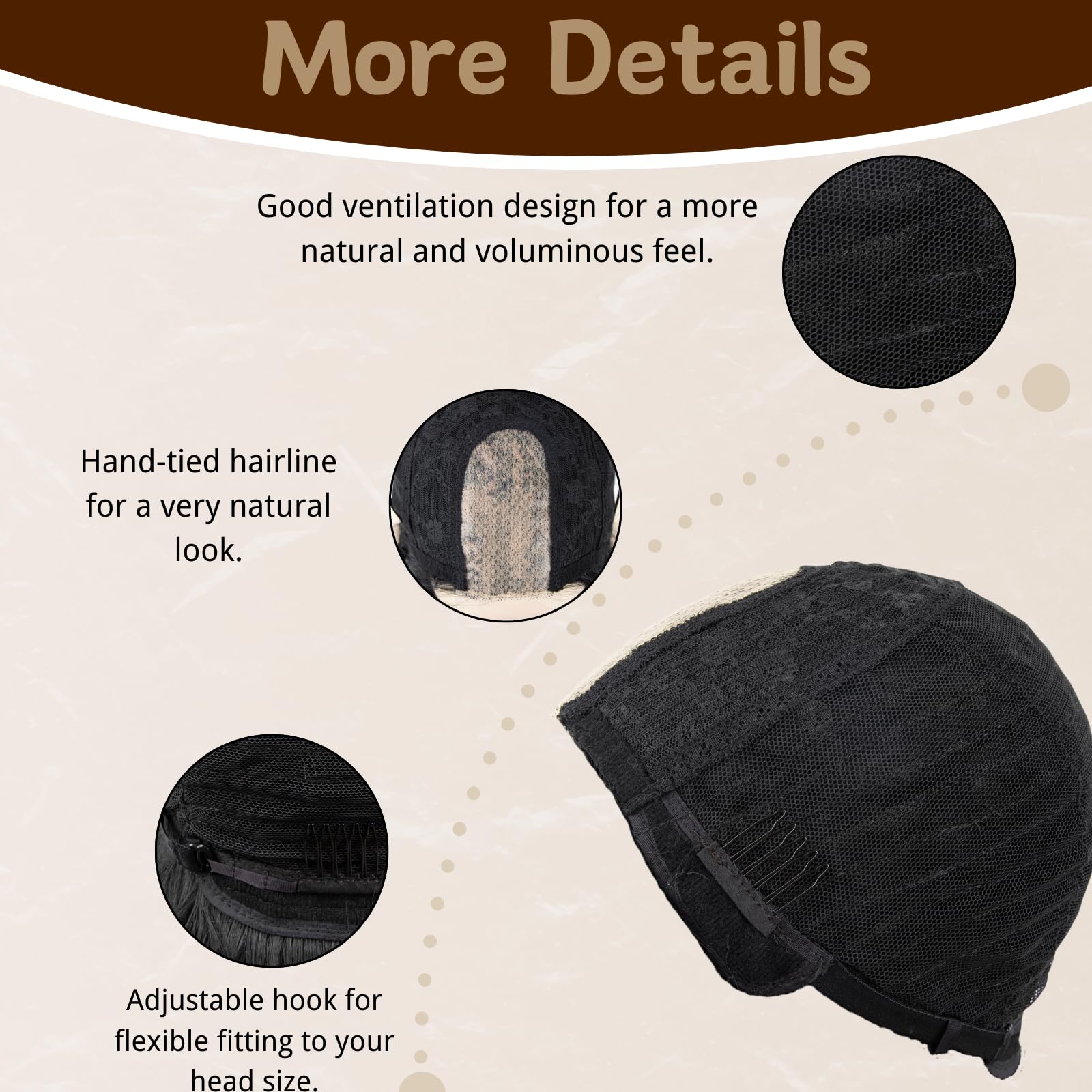 - Adjustable wig cap: Average size (21″-22.5″). Equipped with two elastic straps for a custom fit. The breathable rose net cap ensures comfort. Easy to install and remove, saving you time.